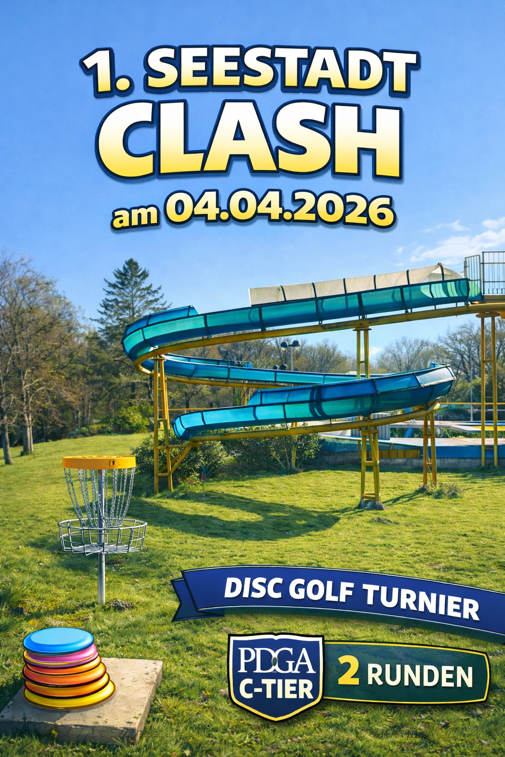 Der 1. Seestadt Clash findet am 04.04.2026 (Ostersamstag) statt. Es werden 9 Bahnen auf dem Gelände des Freibads sowie 9 Bahnen auf dem angrenzenden Fußballplatz gespielt. Das Caddiebook folgt im Februar.